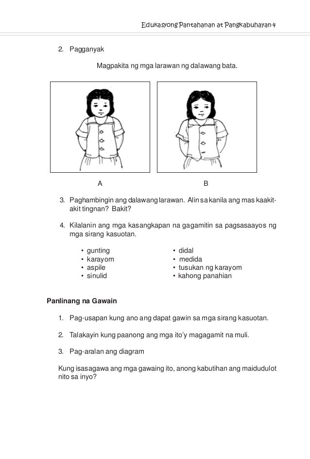 Aug 13, 2017 · mga gamit sa pananahi medida gunting karayom at sinulid didal marie jaja t. New questions in edukasyon sa pagpapakatao. Maaaring yari ito sa plastik o metal. Ito ay magkasamang ginagamit sa pananahi. Karayom at sinulid ito ay ginagamit sa pananahi. Isinusuot ito sa daliri upang magsilbing panulak ng karayom, pardible at aspili. Ang didal ay isang maliit na kagamitan sa pananahi. Emery bag at didal 14. Sa ganitong paraan maiiwasan matusok ng karayom ang mga daliri. Bakit kailangang matutunan ng mga batang kagaya mo ang gamit ng mga kagamitan sa pananahi? Paano nakakatulong sa iyo ang pagkakaroon ng kaalaman sa pananahi. Maaaring yari ito sa plastik o metal. Dapat magkasingkulay ang sinulid at tela o damit na tinatahi.